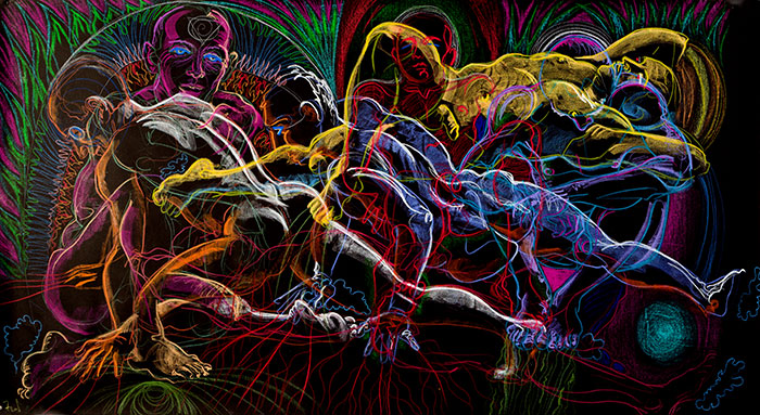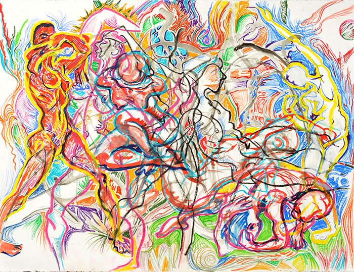 When I am drawing, I am close to the large paper and cannot see the overall pattern. I am down in it, exploring whatever passage I have found for the moment. Later, looking at the drawing from a distance, I see it abstractly, as veins of color in a crystal, or as objects in a whirlwind. Then the eye discovers a face or part of a body, and that is an opening into the image, which can be traveled like a path through the woods, or like a strand of thought through the din of the chattering mind.