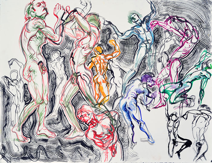 I work on the floor, crawling over the large sheet and covering it with overlapping sketches of movement or quick poses taken by a model-collaborator. Once the drawing reaches a certain density, like a tangle of threads, I begin to work on carving a structure out of this undifferentiated energy field. I bring some of the layers of drawing forward by adding depth and weight to the forms, and push others into the background or into abstraction. I alternate between crawling on the drawing, where individual lines can be followed like paths, and standing back to get a sense of overall form and balance.