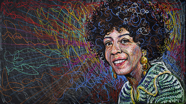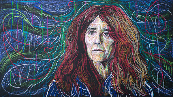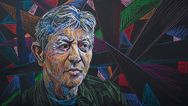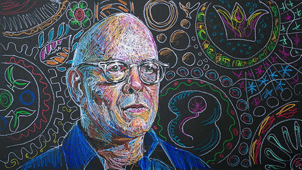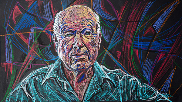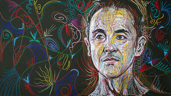 These drawings could not be done from life, as I always prefer in portrait drawing, but had to be done from photographs, or, in most cases, freeze-frames from video interviews. They also had to be made to fit the wide 16 by 9 aspect ratio used for high-definition video, not the frame I would usually select for a portrait. This means much of the frame would be background, so I’d need to develop background designs for each face. I set up an easel with a camera on a tripod behind it, and as I worked on the drawings I stopped frequently to snap photographs of the work in progress. The photographs were used to make animations of the drawings as they come into being, layer by layer.