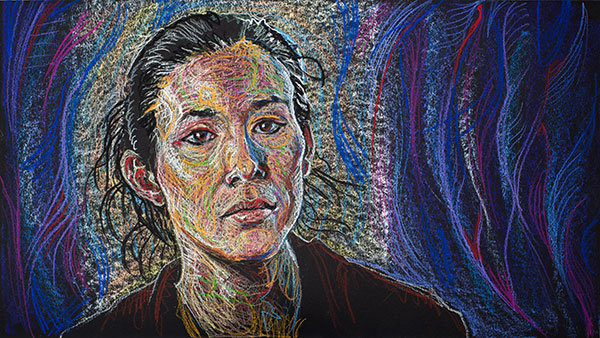 In the Figureworks exhibition, I showed the portrait as a multimedia piece, with the original 18″ x 24″ drawing hung alongside a digital screen playing an animation of the drawing as it built up, layer by layer. Here’s the video (email subscribers will need to click the link to see the video on Vimeo.